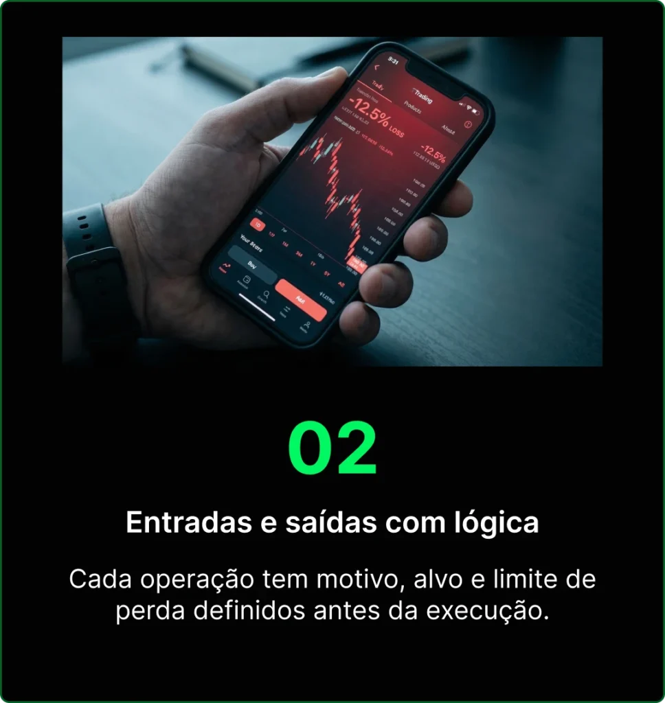 Cada operação tem motivo, alvo e limite de perda definidos antes da execução.